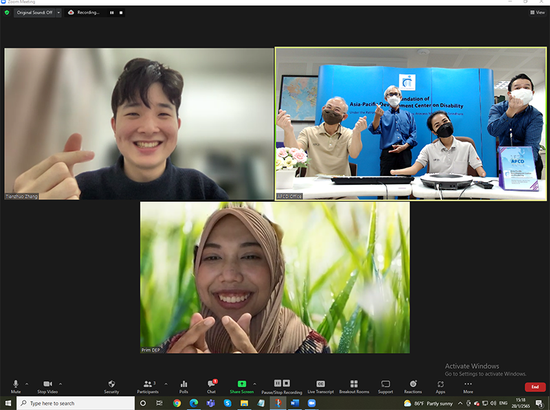 Mr. Tianzhuo Zhang (left hand on top), an APCD intern from China, served as a speaker of the online session and he has a group shot with APCD staff and a colleague from the Department of Empowerment of Persons with Disabilities (DEP).