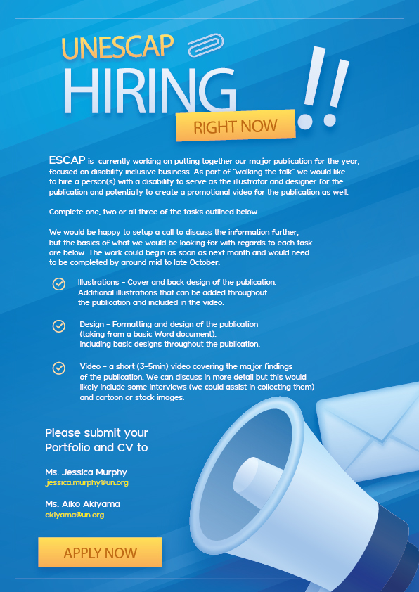 ESCAP is currently working on putting together our major publication for the year, focused on disability inclusive business. As part of “walking the talk” we would like to hire a person(s) with a disability to serve as the illustrator and designer for the publication and potentially to create a promotional video for the publication as well.