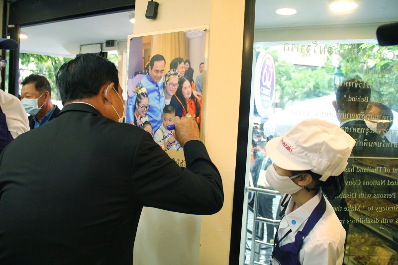 ฯพณฯ พลเอก ประยุทธ์ จันทร์โอชา นายกรัฐมนตรี ลงนามอวยพรเพื่อความสำเร็จของร้าน ในรูปถ่ายหมู่ร่วมกลุ่มคนพิการ